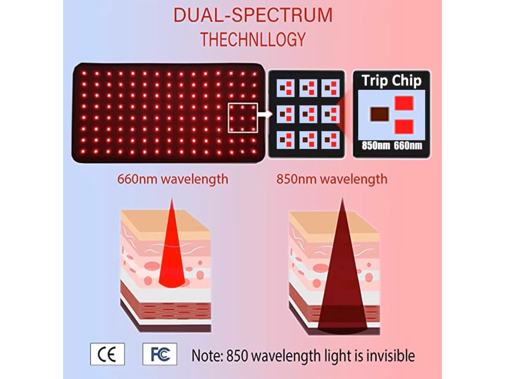 Mélyvörös 660 és közeli infravörös 850 nm, a fényterápia legjobb hullámhossza. Az infravörös 850nm láthatatlan fény az emberi szem számára, így nagyon homályosnak tűnik, és a mélyvörös 660nm nagyon fényesnek tűnik. Külön kapcsolható hullámhosszok, Időzítés állítás