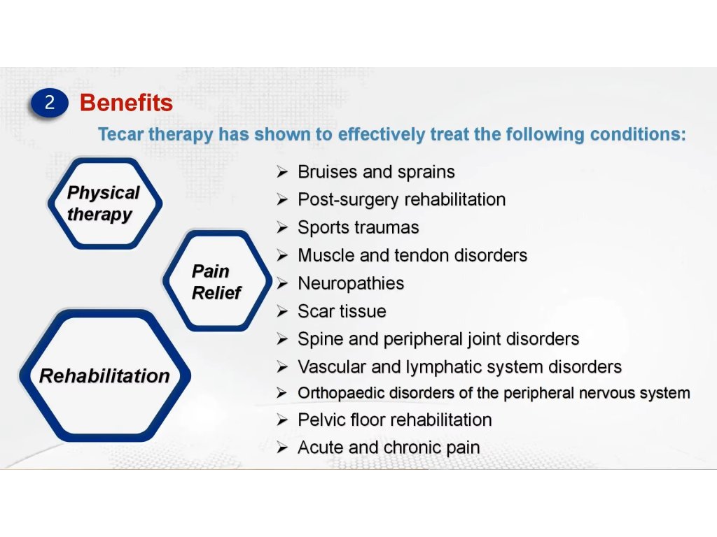 2. A Tecar terápia jótékony hatásait elsősorban a fizikoterápiában, rehabilitációban és fájdalomcsillapításban alkalmazzák:
