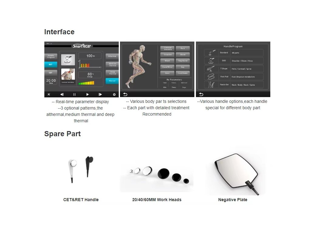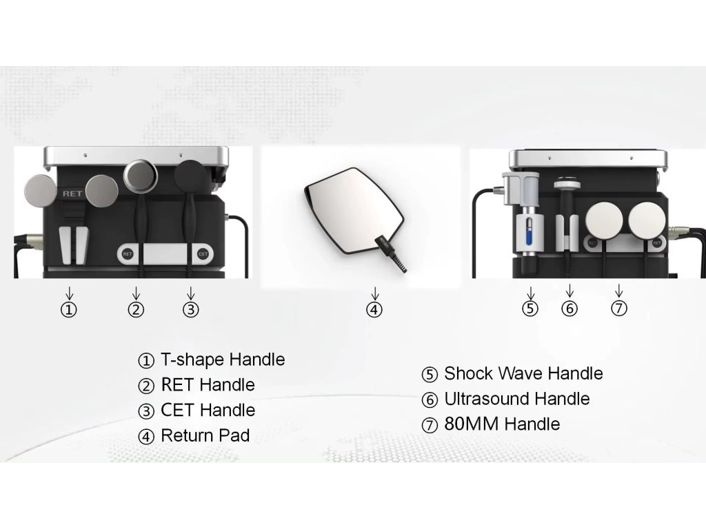 A CET-technika olyan szövetekben működik, amelyek nagy mennyiségű elektrolitot tartalmaznak, például izmokban és lágyszövetekben. A RET technika nagyobb ellenállású szövetekben, például csontokban, inakban és ízületekben működik. A RET mélyebb behatolása elősegíti a makacs zsírok feloldását és lágyítását, valamint a testzsír keringését a fogyás elérése érdekében. Mindegyik fogantyúnak 3 alkatrésze van: 20/40/60mm